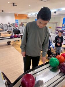 当日、ボウリング場に着くと、まずは貸し靴を借りて、自分にぴったりのボールを選びます。カラフルなボールを前に、「これにする!」「指の穴がちょうどいい!」と真剣な表情。