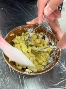 レンジで加熱してホクホクになったさつまいもを、いよいよ「もち」に変身させます!潰したさつまいもに、砂糖、豆乳、塩を加え甘さを調整。片栗粉も入れて、ひたすら混ぜます!これがもっちりとした食感の決め手になりました。