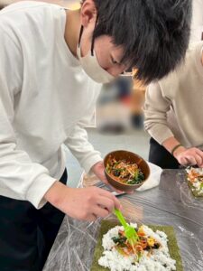「海苔の上にごはんを薄く敷いて、具材がこぼれ落ちないように、ギュッと巻くんだよ」というアドバイスを聞きながら、みんな真剣な表情。